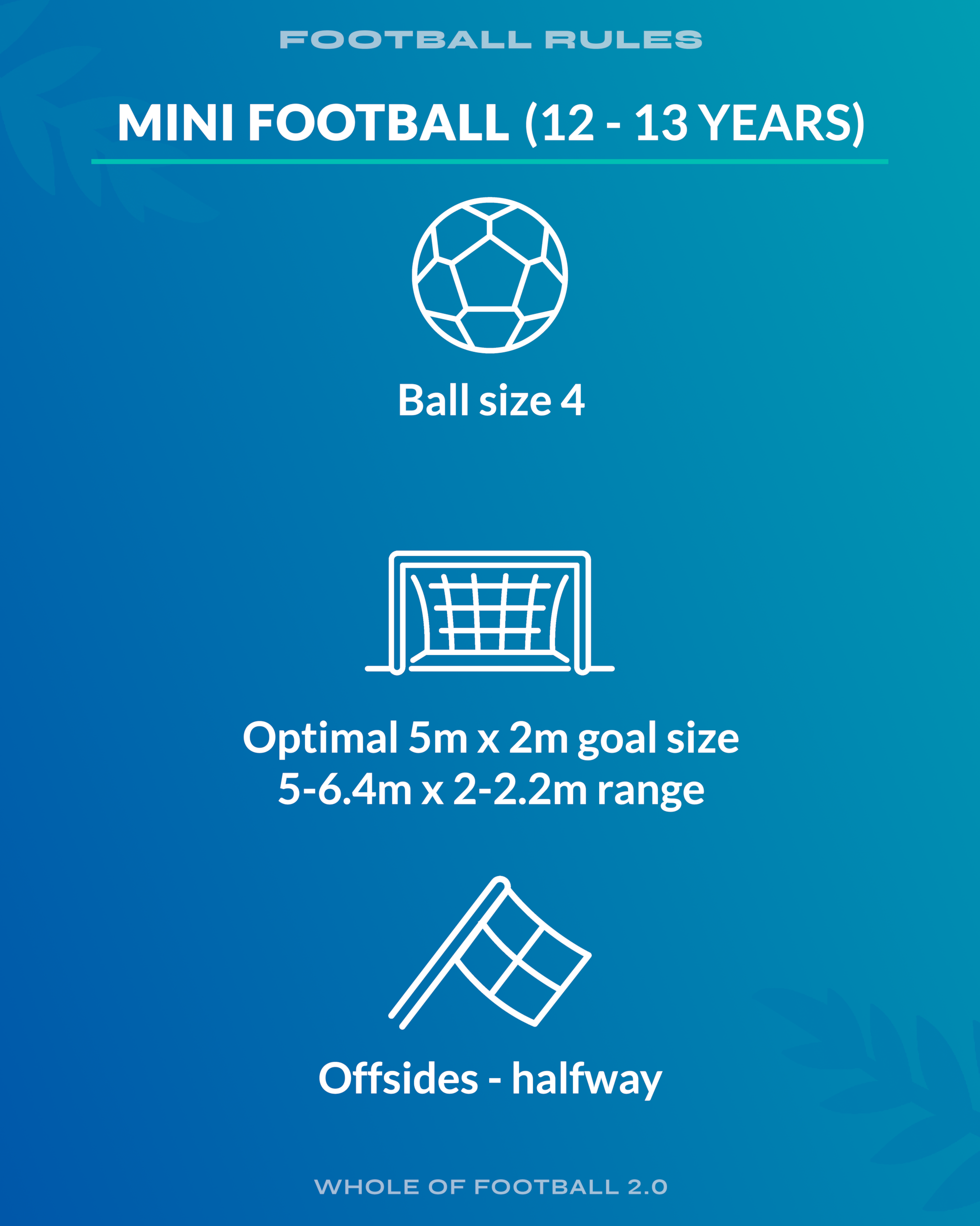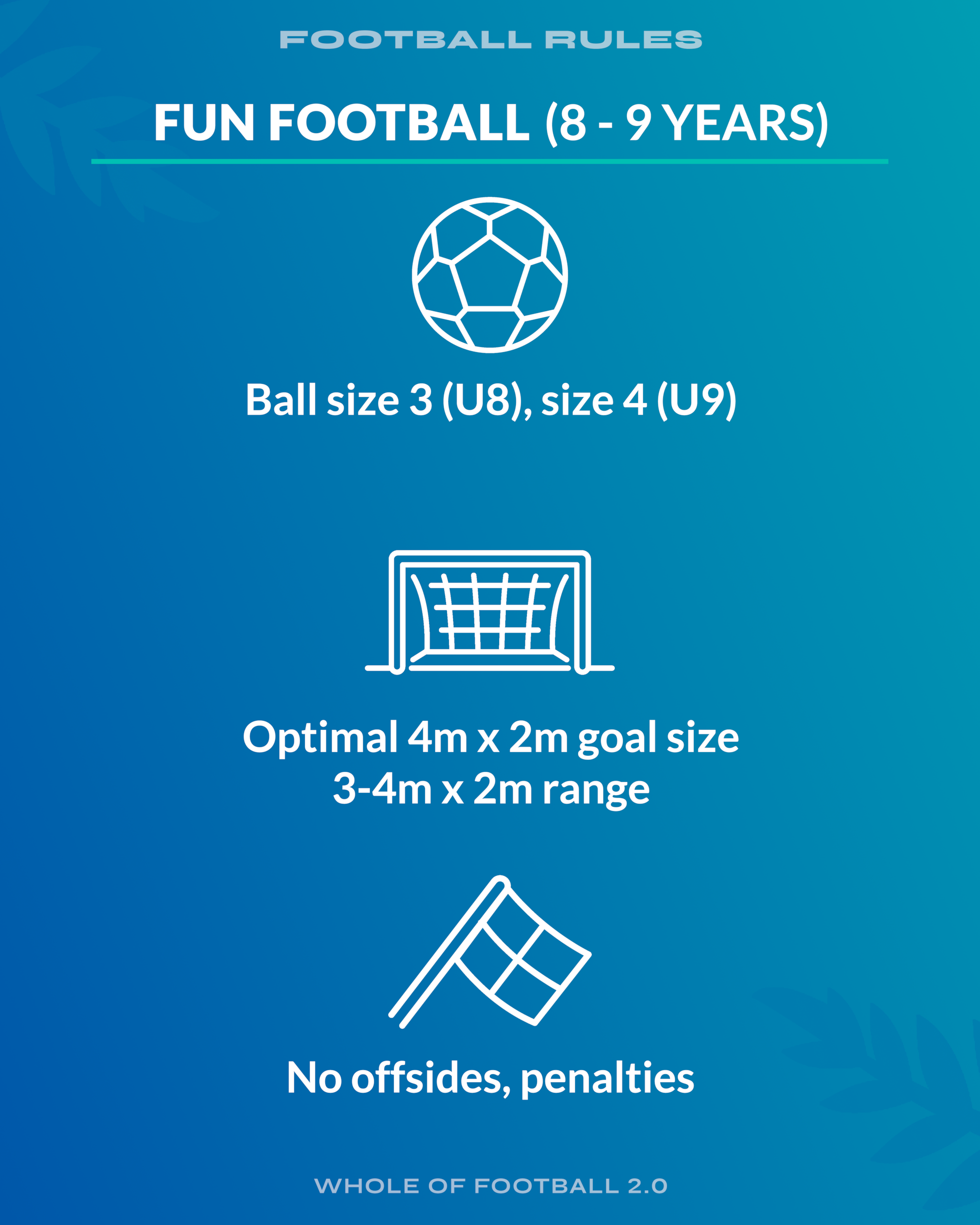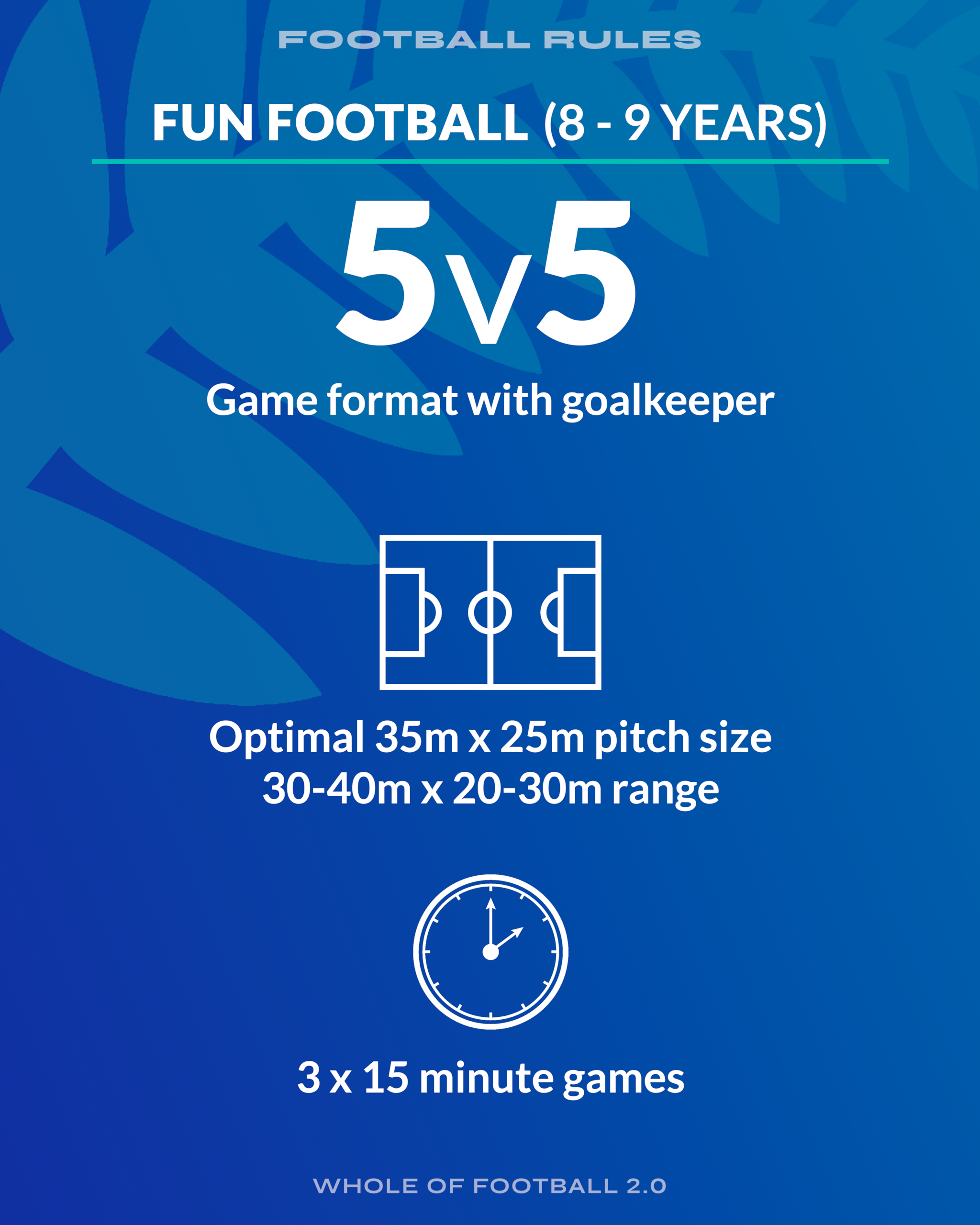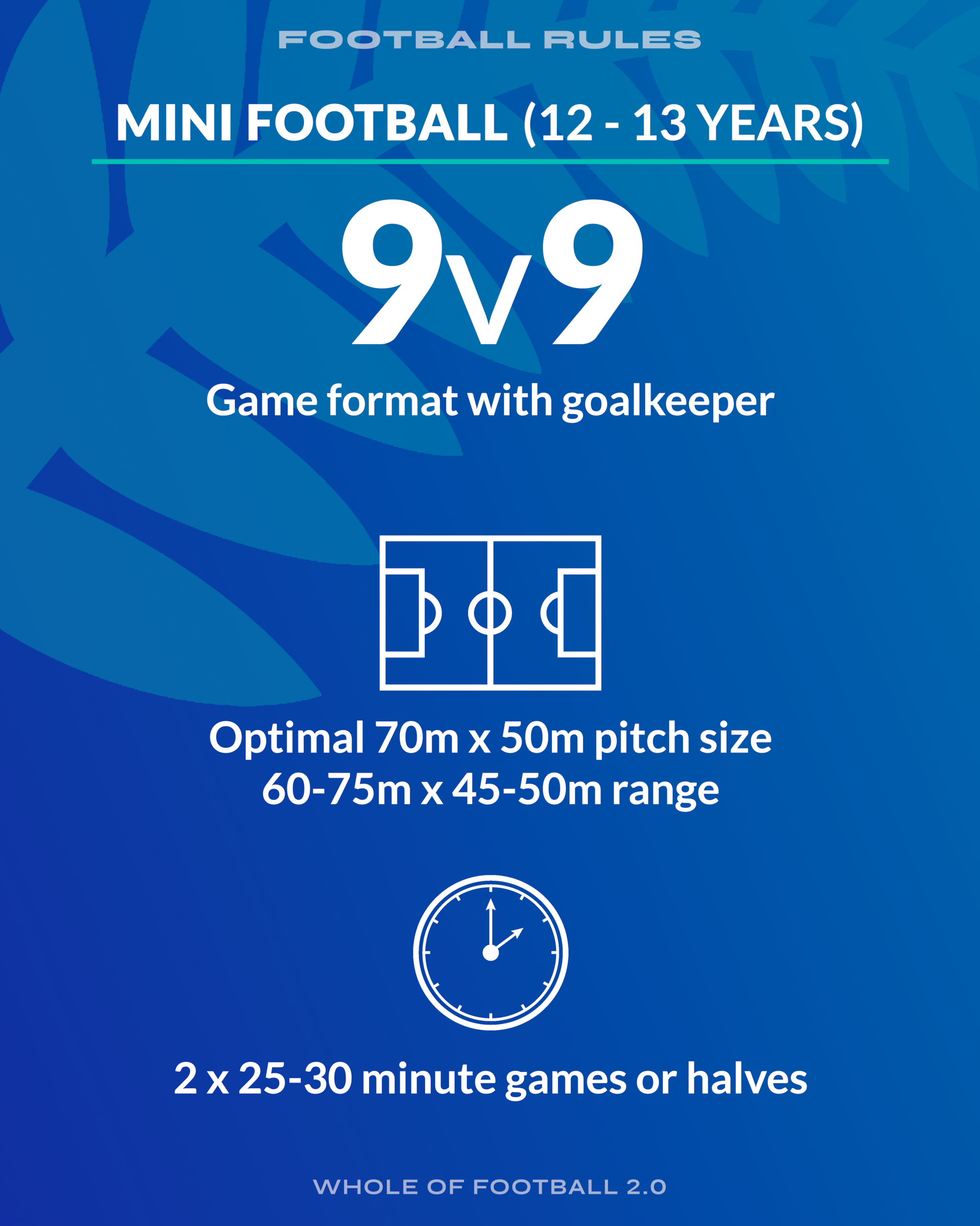 Fun is still the key motivator, so players learn through enjoyable, game-like scenarios in smaller formats, helping them transfer skills into 7v7 (10-11 years) and 9v9 (12-13 years) Mini Football.