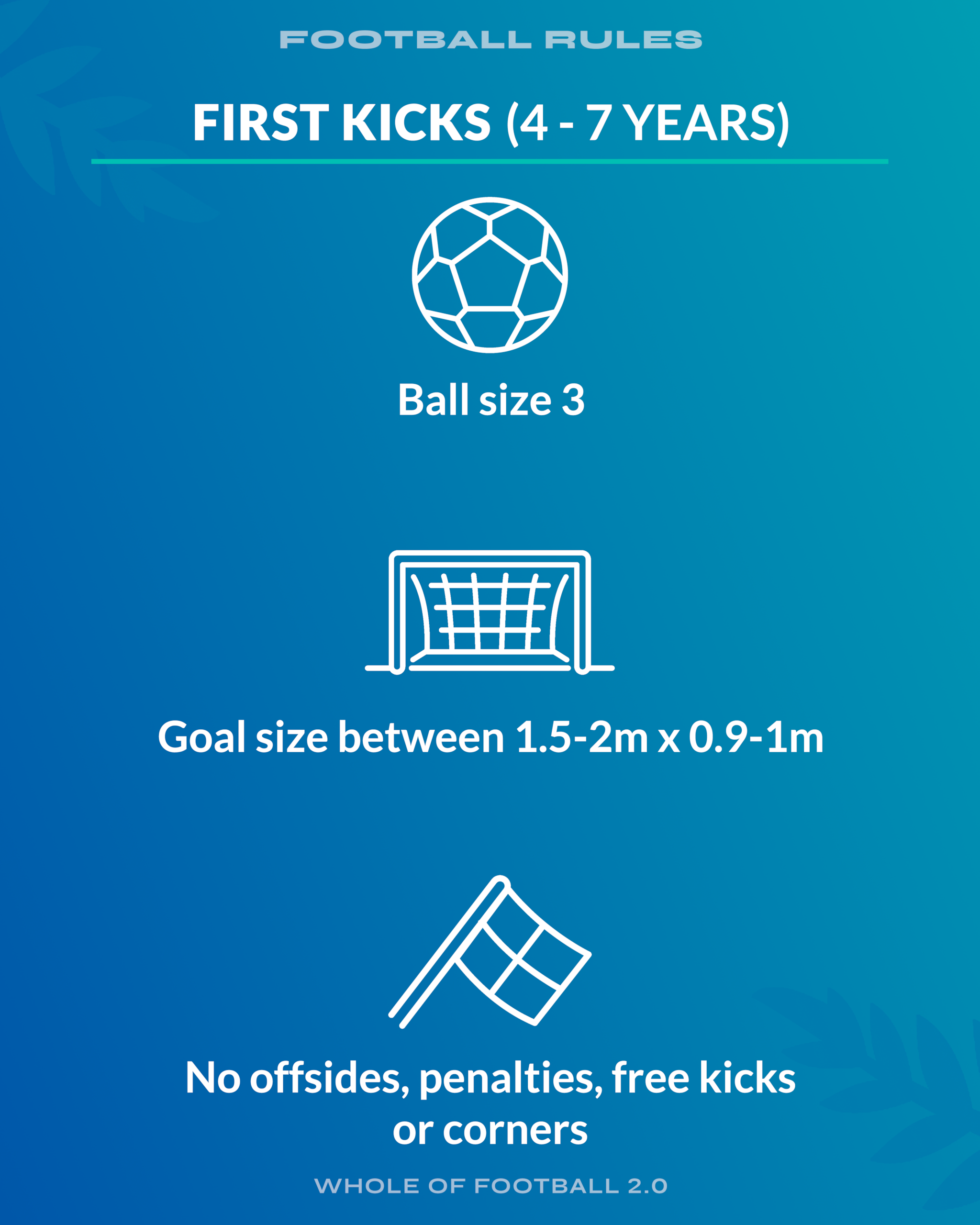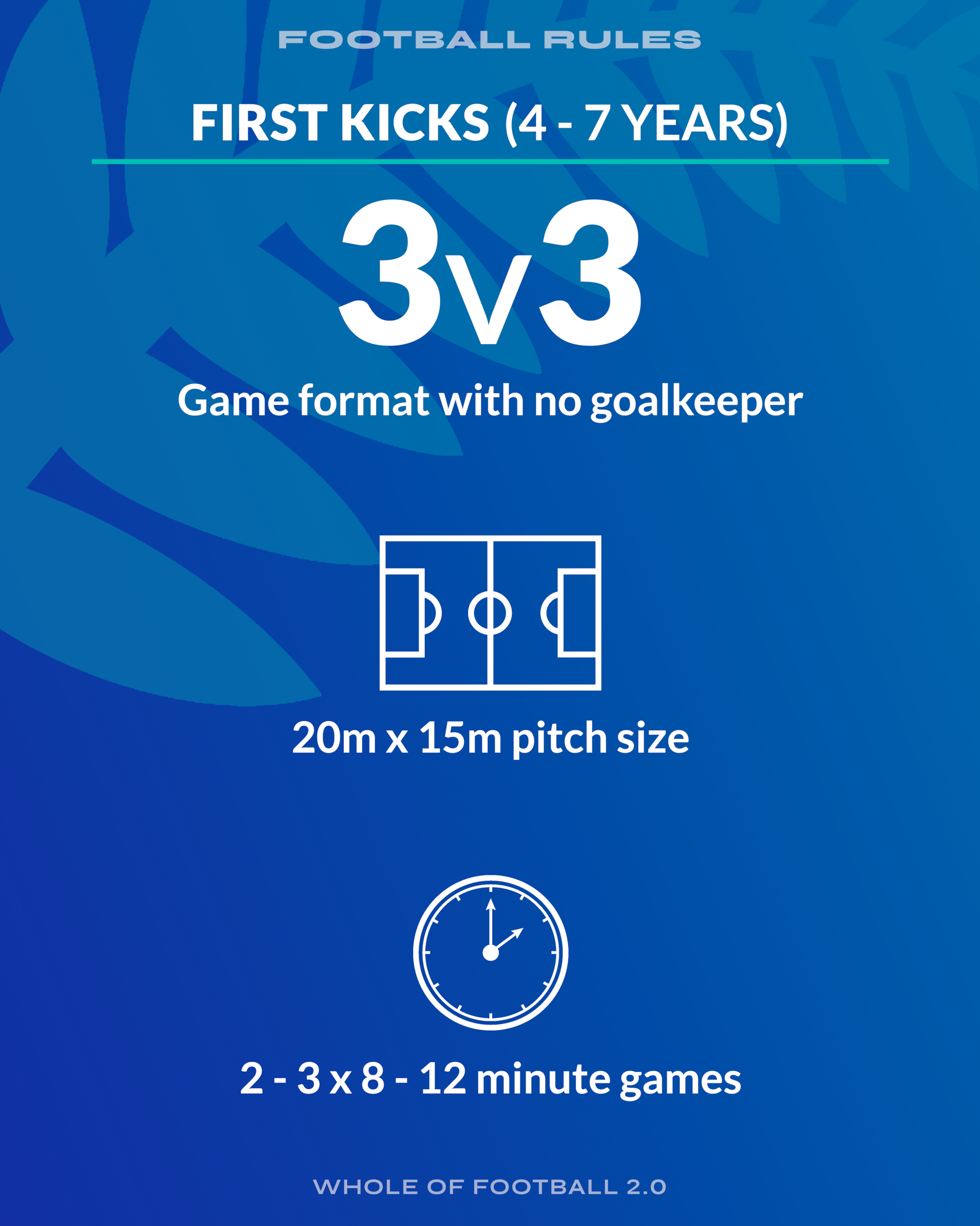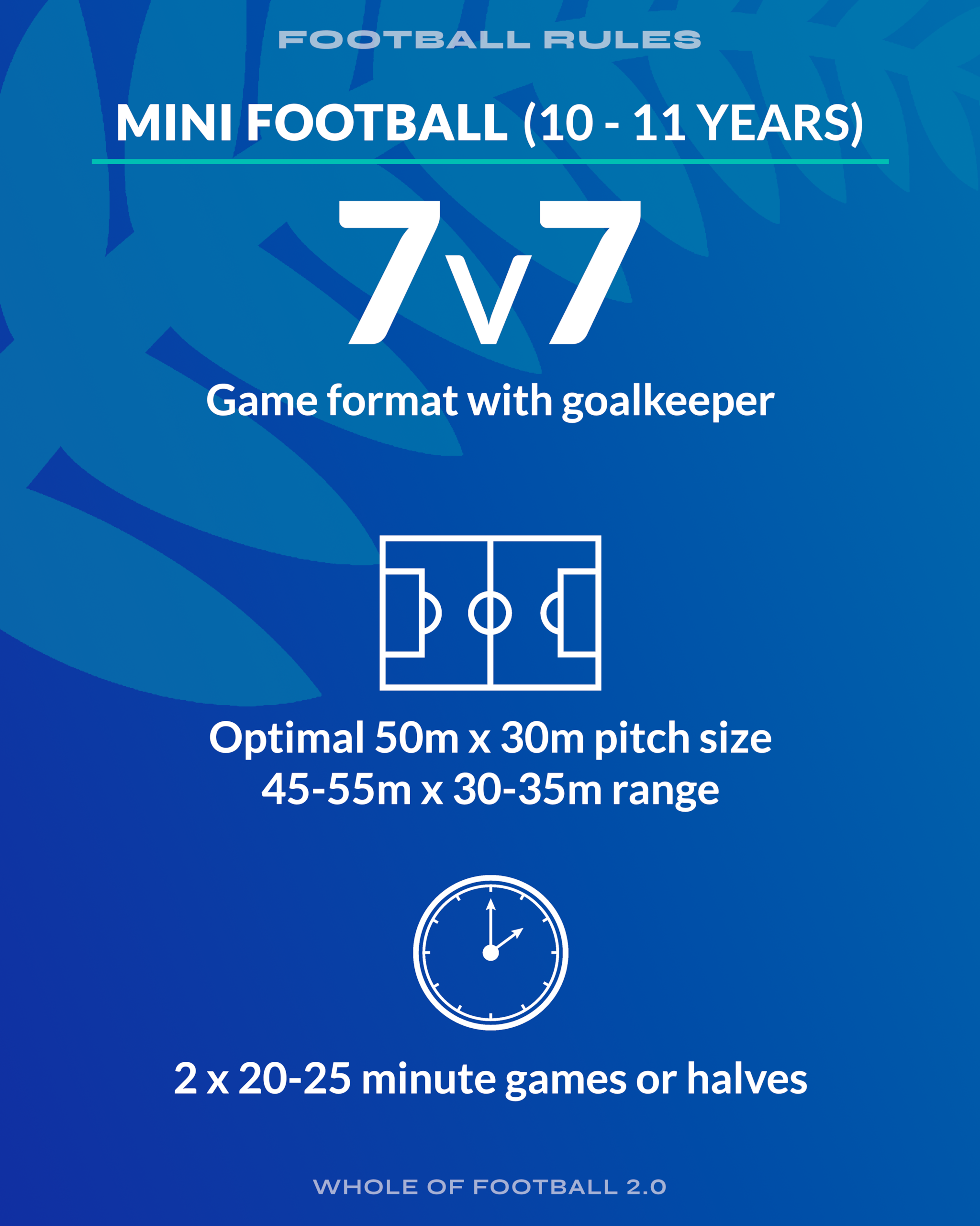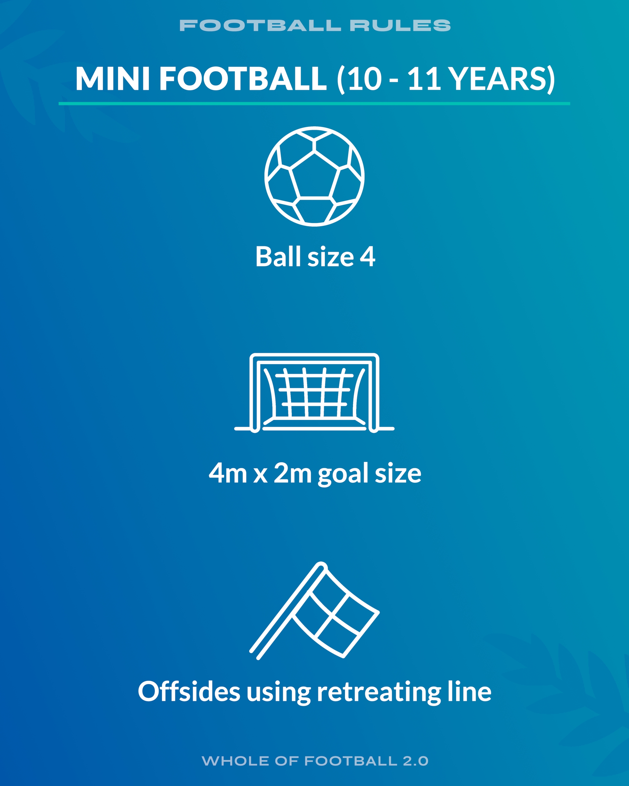 Fun is still the key motivator, so players learn through enjoyable, game-like scenarios in smaller formats, helping them transfer skills into 7v7 (10-11 years) and 9v9 (12-13 years) Mini Football.