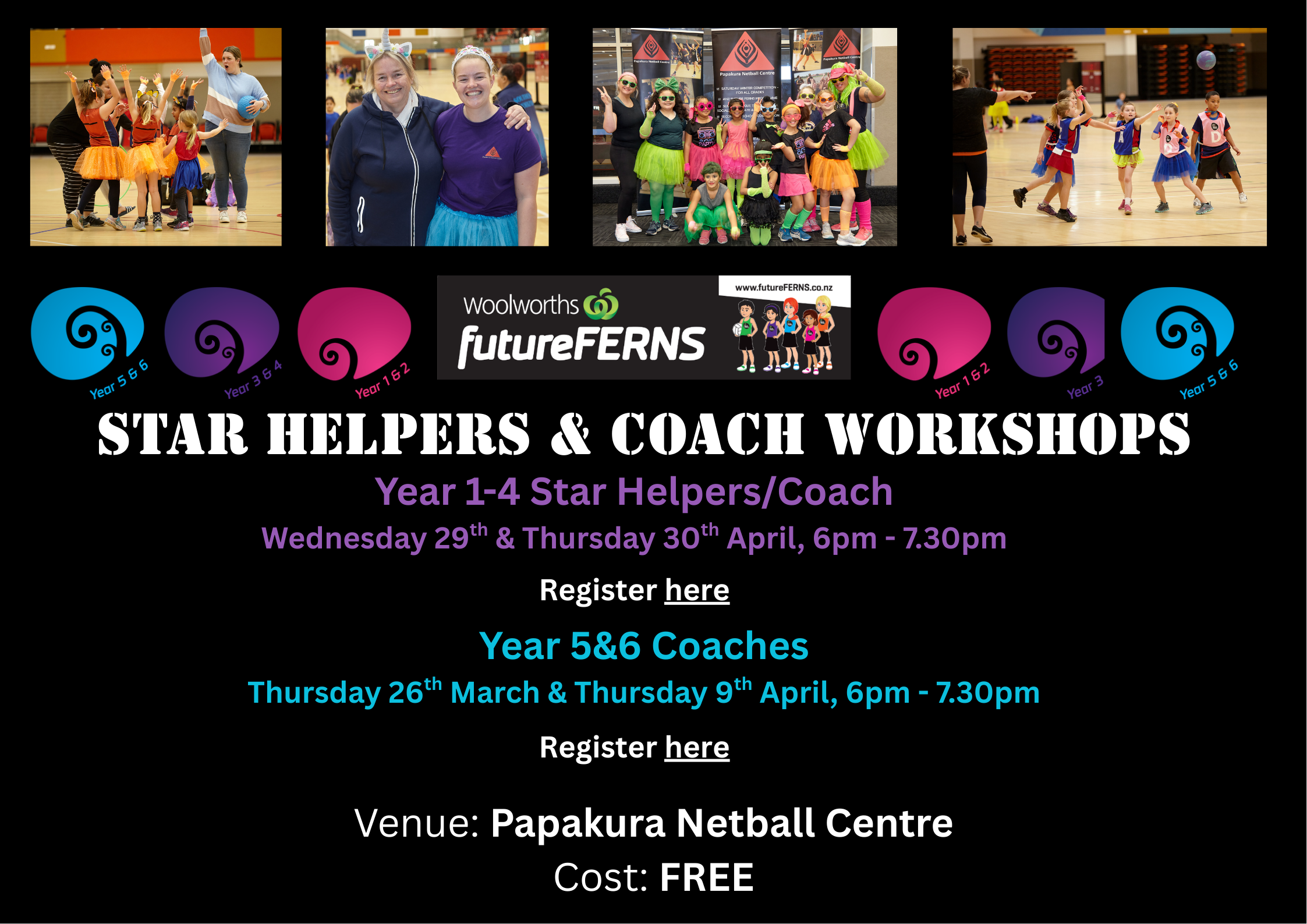 Woolworths futureFERNS aims to provide the players a fun and safe environment, maximise opportunities to participate. The programme encourages the development their skills and provides a progressive introduction to Netball, developing a lifelong love of the game.