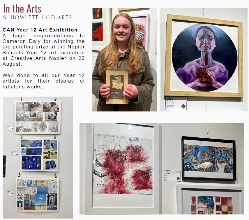 Other opportunities include participation in the Bay-wide Art exhibitions, gallery and museum visits, workshops at EIT and there is also an 'Artist of the Month' awarded to a Junior and Senior student at our school assemblies and in our school Newsletters.